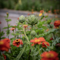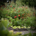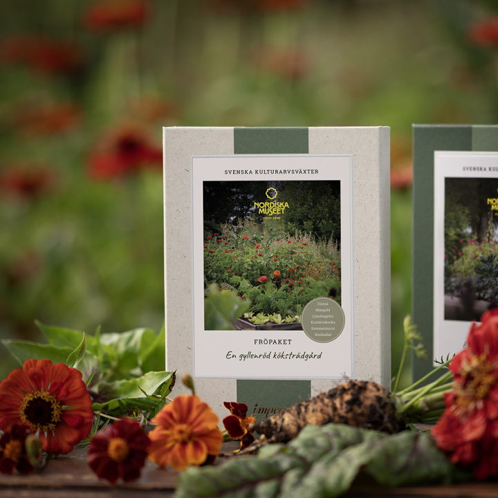 Kullanpunainen keittiöpuutarha – Sekoitus, joka antaa lämpöä myös pilvisinä päivinä. Juhlavat artisokat tuovat korkeutta oranssina hehkuvaan samettikukkien kukkamereen. Porkkana ja mangoldi hehkuvat syvän punaisen ja oranssin sävyissä. Raikas keräsalaatti rauhoittaa kokonaisuutta vihreydellään, kun taas tsinniat säteilevät kuin pienet auringot lehtien yllä.